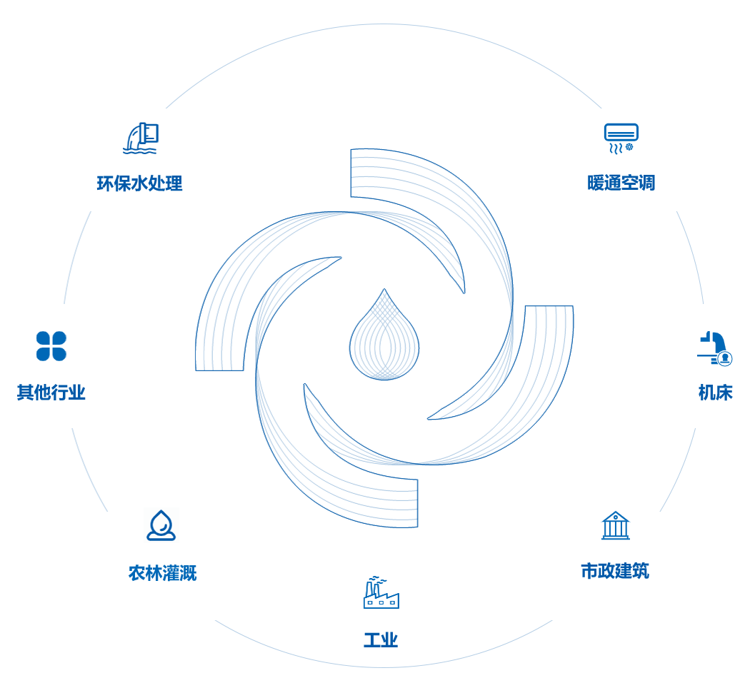 旗下系列產品廣泛應用于環保水處理、暖通空調、機床、市政建筑、工業、農林灌溉等諸多領域。