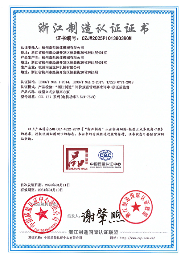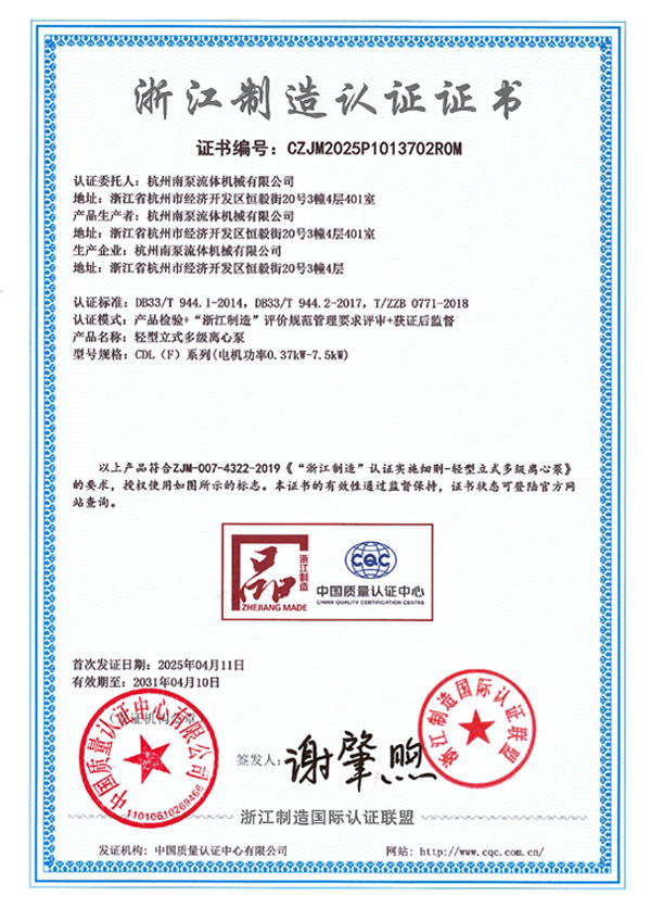 浙江制造認證證書-CDL(F)系列(電機功率0.37kW-7.5kW)